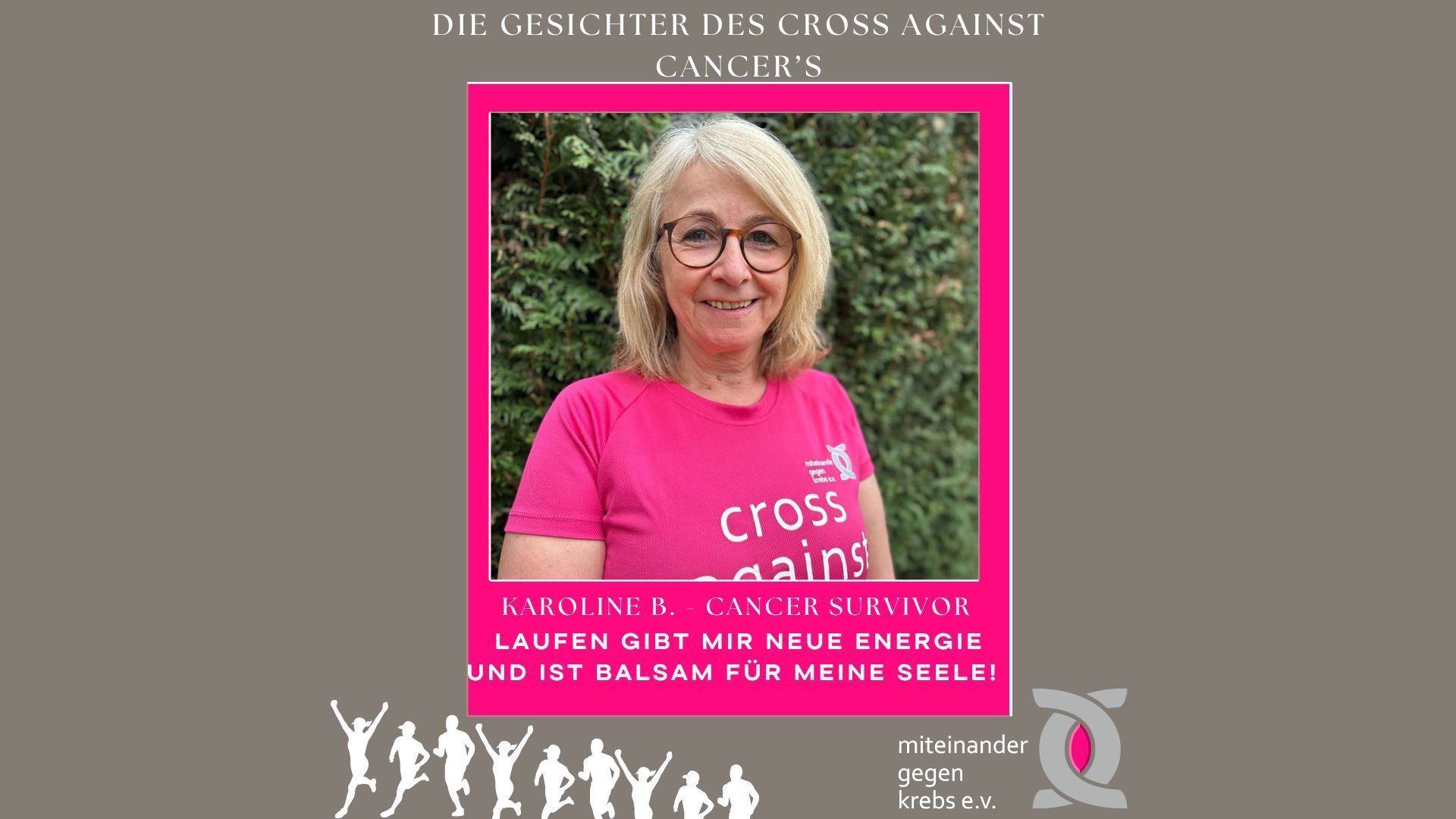 Karoline hatte 2018 eine Krebsdiagnose und ist seitdem Teil unseres Cross against cancer Laufs! Seit 2019 ist sie als aktive Läuferin mit dabei. Ihr Motto ist „Laufen gibt mir neue Energie und ist Balsam für meine Seele!“