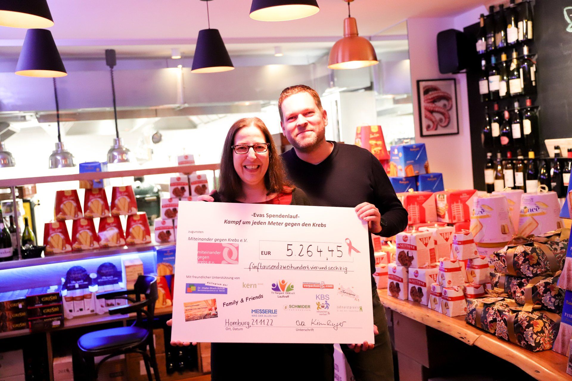 Wir als Verein Miteinander gegen Krebs e.V. sind von Eva, ihrer Familie und ihrer Großzügigkeit gerührt und fühlten uns geehrt diese Spende in privater Atmosphäre im Vin!oh Homburg entgegen nehmen zu dürfen. Wir bedanken uns auch auf diesem Wege nochmal recht herzlich bei Eva, ihrer Familie und allen Sponsorinnen und Sponsoren, die Evas Idee und ihren Traum mit ihr gemeinsam getragen und zu einem so großen Erfolg beigetragen haben und damit zeigen, dass auch ein einzelnes, vermeintlich „kleines“ Licht unglaublich hell leuchten kann und uns alle berührt. Danke dir Eva!